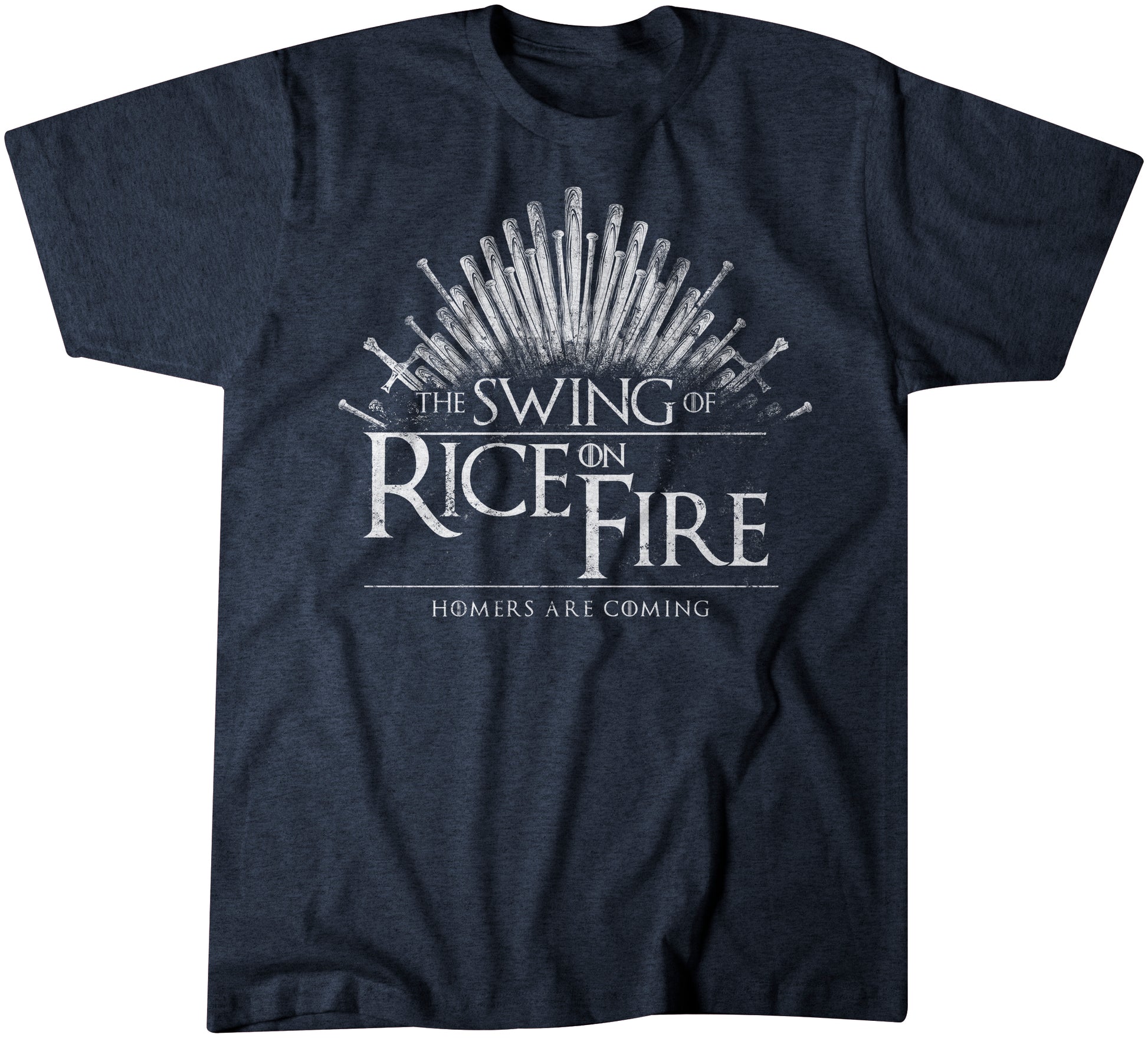 The design features the title "The Swing of Rice on Fire" boldly emblazoned in front of a throne of bats which replaces the Iron Throne, signifying his rightful place as a rising star in baseball.